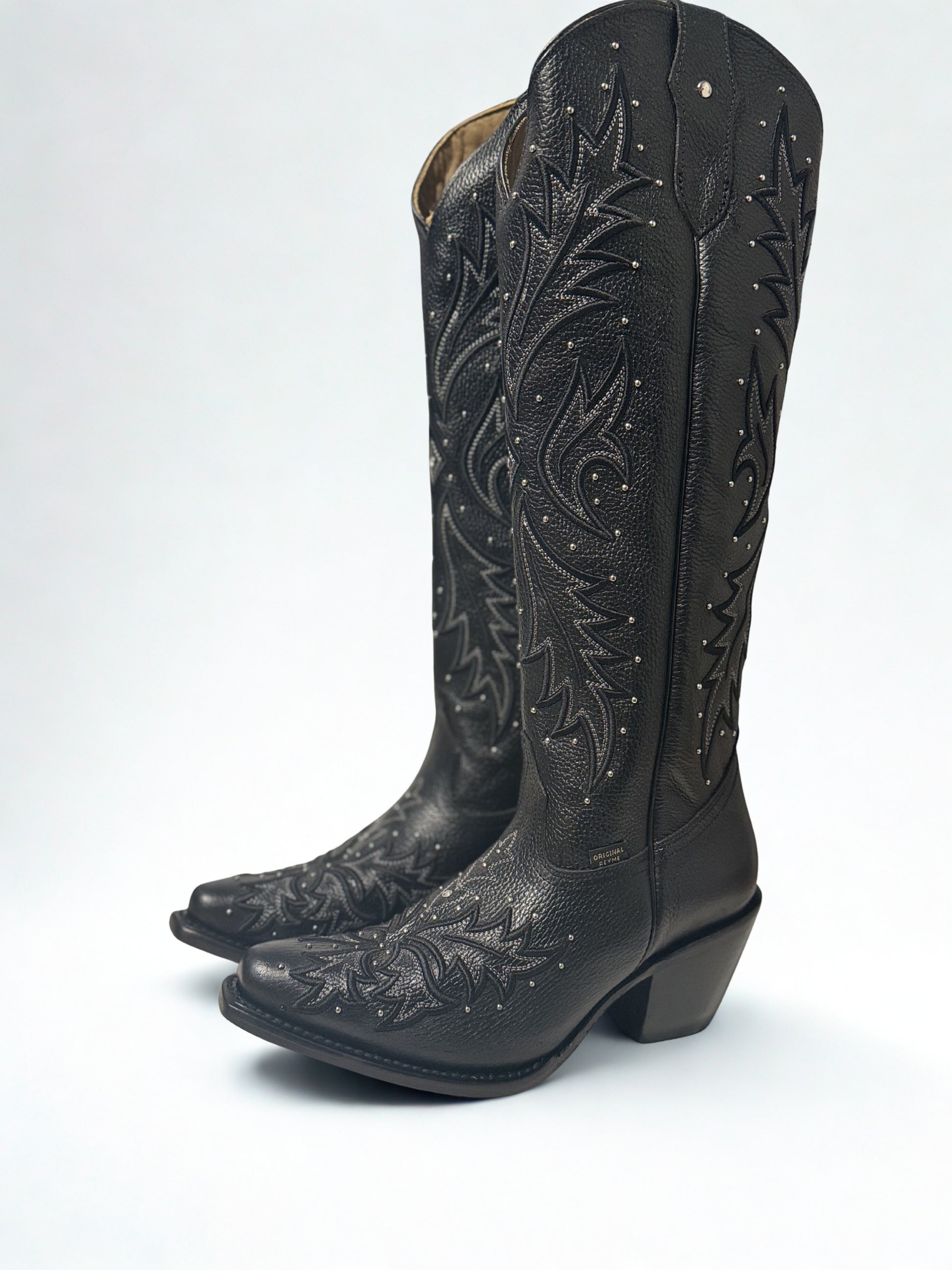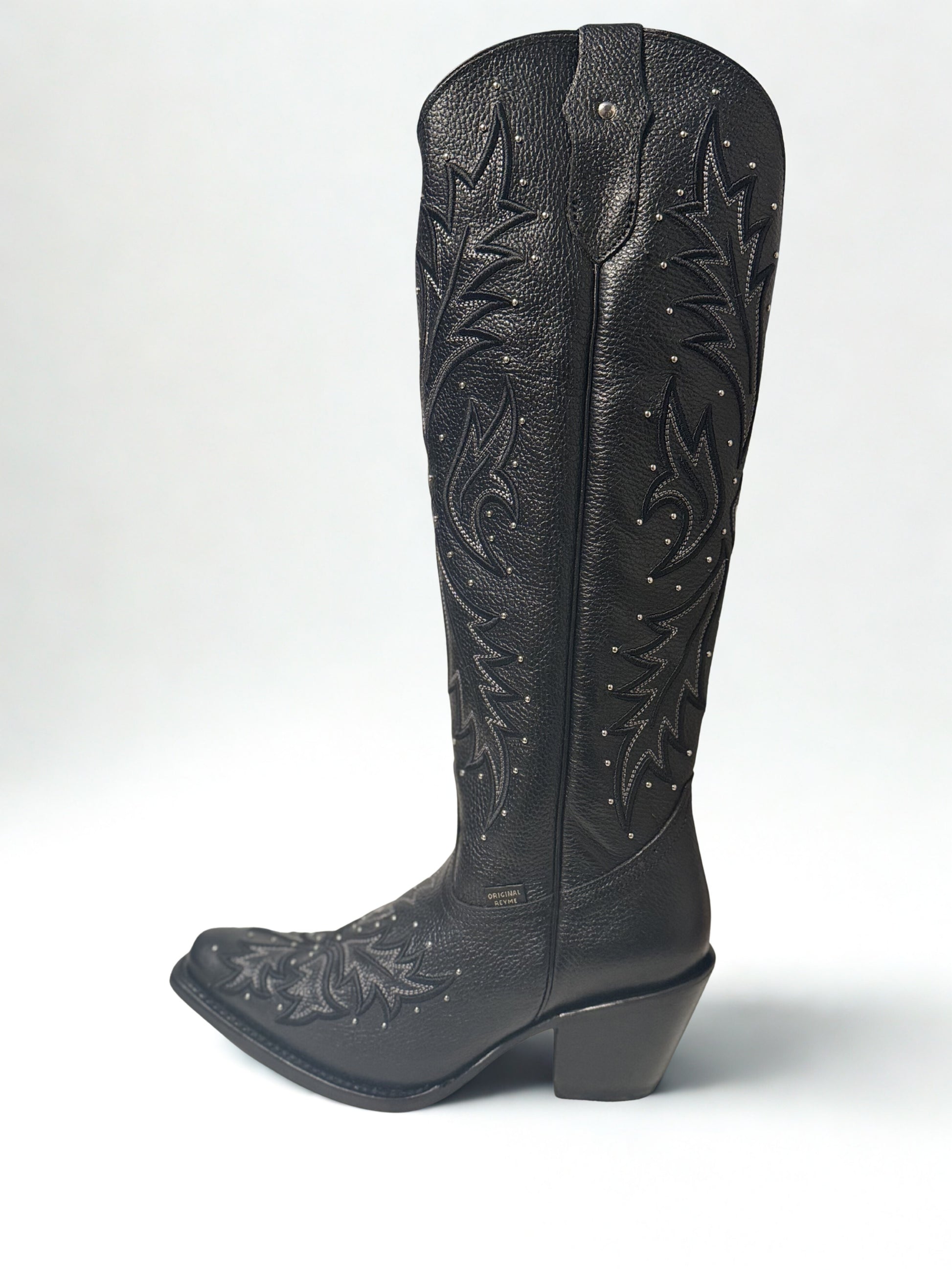 Embroidery & Detailing: Intricate flame-style stitching across the shaft and vamp, accented with small metallic studs for a touch of shine and modern flair.