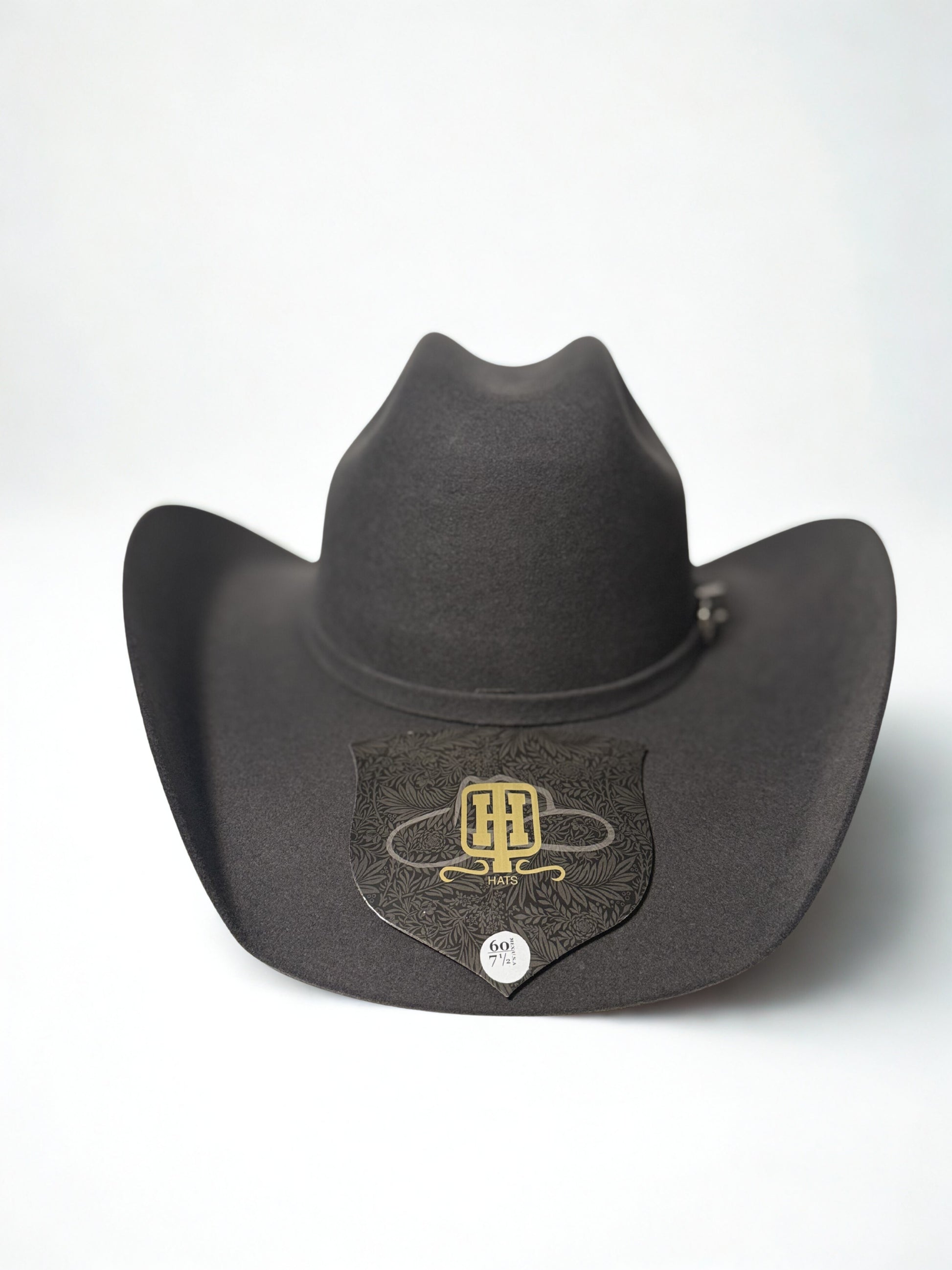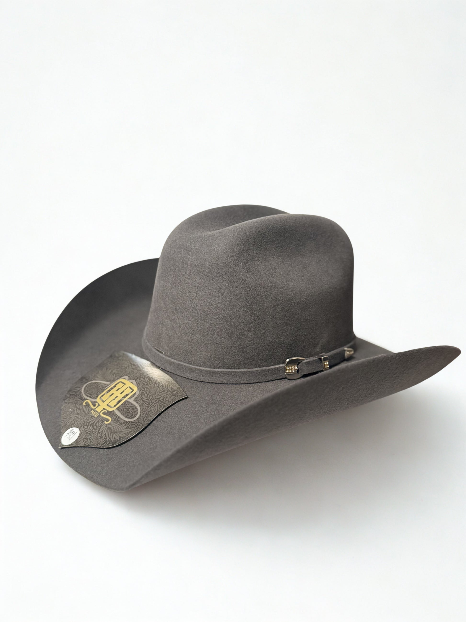 This is a 100X premium gray felt tejana, designed with a smooth, high-quality finish and a clean cattleman crease. The hat features a matching gray hatband accented with a silver-tone three-piece buckle set, giving it a classic Western touch.